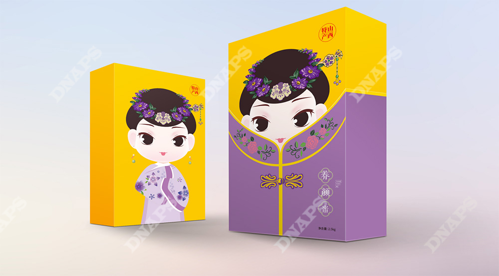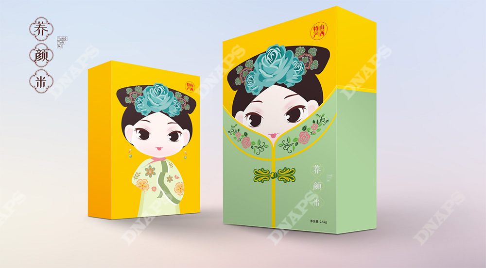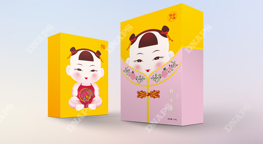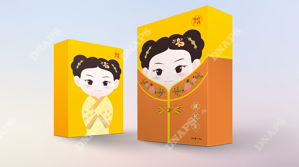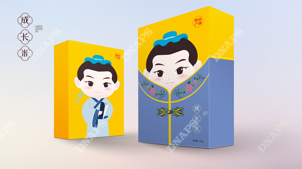 區(qū)別于傳統(tǒng)小米包裝,根據(jù)小米的不同搭配將小米分為月子米,成長米,養(yǎng)顏米3類,視覺上分別以成對的嬰兒、小孩、年輕女性/媽媽為主要形象元素,采用現(xiàn)代插畫的形式創(chuàng)造三組萌趣生動的形象,畫面生動富有張力,配色清醒典雅,增強產(chǎn)品親和力。包裝盒外加設計有古典服飾圖形的封套,整體形式新穎富有層次感,拆掉封套將呈現(xiàn)另一幅畫面,開盒有趣味,讓整體形成記憶點。