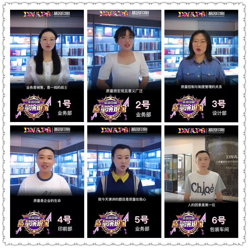為了讓“質(zhì)量”意識(shí)深入人心,基因印刷組織了一場(chǎng)別開(kāi)生面的“質(zhì)量演說(shuō)家”演講比賽。負(fù)責(zé)人積極商討比賽形式,最后決定通過(guò)視頻錄制的形式公開(kāi)發(fā)布在線上請(qǐng)客戶和全體員工投票。票選出的優(yōu)秀代表在本周六的質(zhì)量大會(huì)上進(jìn)行現(xiàn)場(chǎng)的演講。新穎的比賽形式激發(fā)了全體員工的熱情,各部門(mén)員工踴躍參與,利用早會(huì)和空余時(shí)間進(jìn)行練習(xí)和彩排,最后共有16人脫穎而出。不同部門(mén)的員工從不同的角度詮釋了自己對(duì)“質(zhì)量”的理解,一遍遍的練習(xí),一遍遍的重復(fù),不僅演講人自己,聽(tīng)的人也在不知不覺(jué)中對(duì)“質(zhì)量”有了自己的思考。